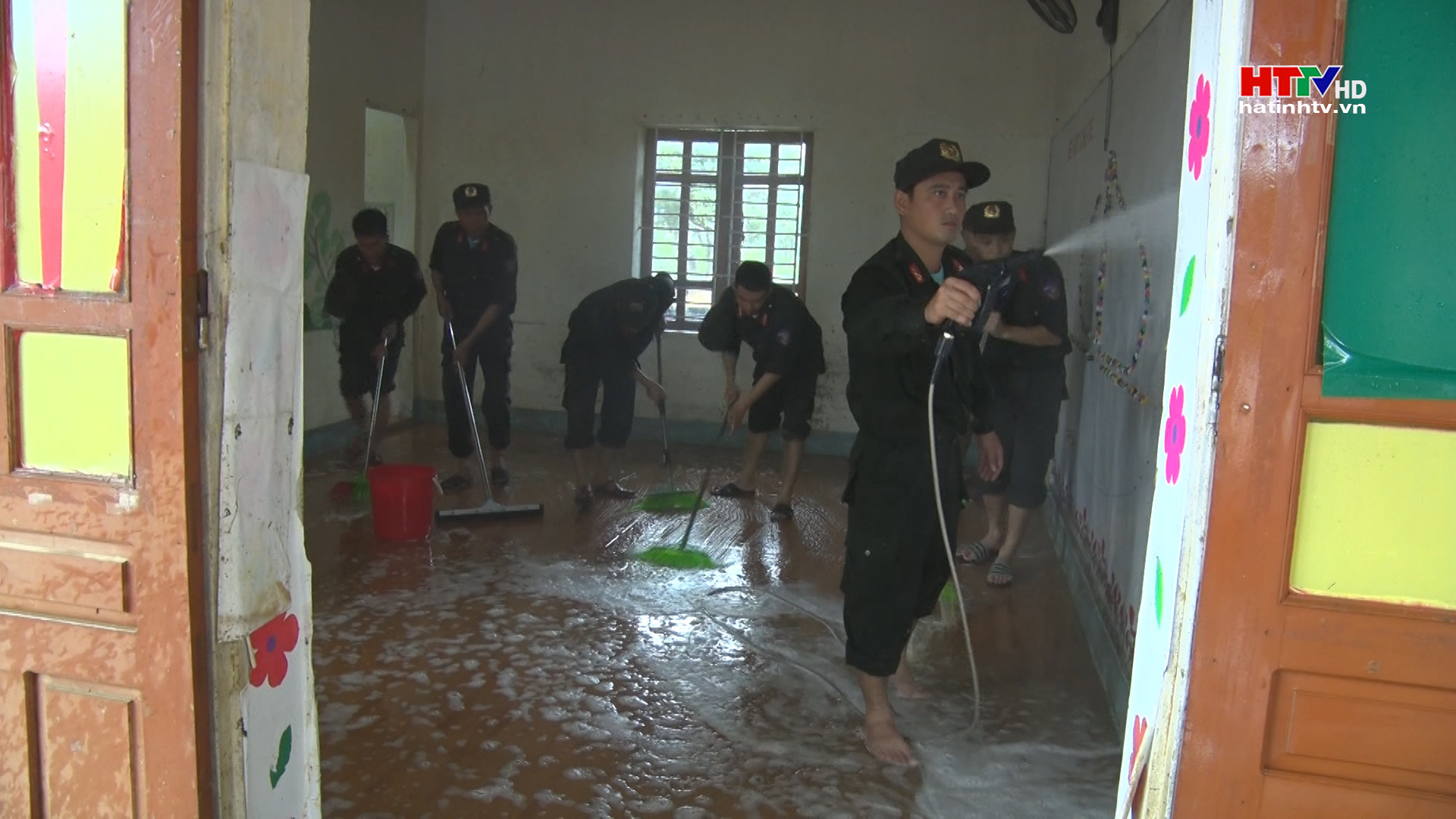 Nhằm giúp người dân vùng ngập lụt ở huyện Hương Khê sớm ổn định cuộc sống, học tâp ngay sau khi nước rút, cán bộ, chiến sỹ công an của các đơn vị đã về hỗ trợ các xã dọn dẹp vệ sinh trường lớp, xử lý môi trường.