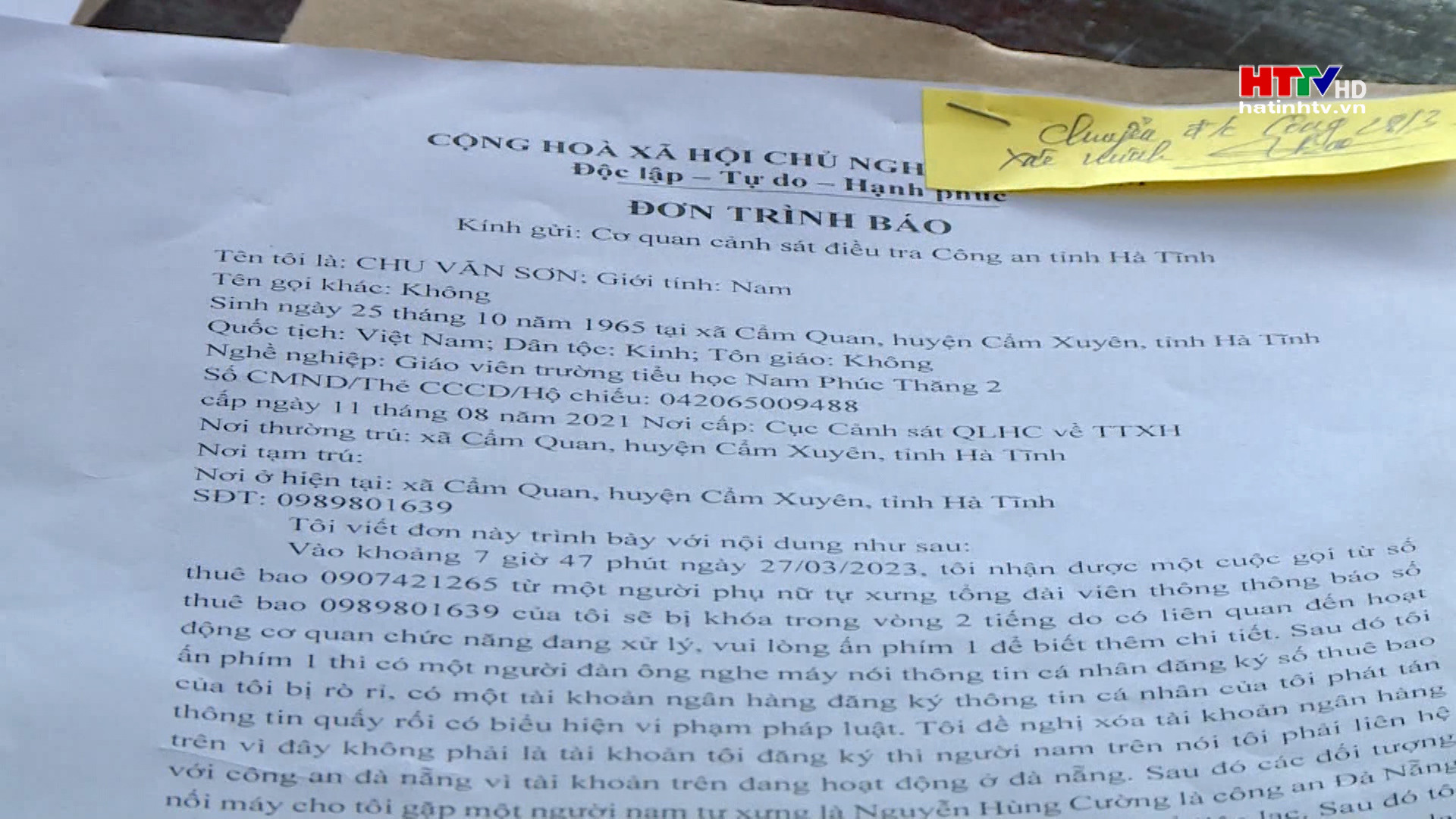 Mới đây, Phòng Cảnh sát hình sự, Công an Hà Tĩnh tiếp nhận đơn tố cáo của ông Chu Văn Sơn ở xã Cẩm Quan, huyện Cẩm Xuyên về việc bị nhóm đối tượng giả mạo nhà mạng và cán bộ Công an để lừa đảo, chiếm đoạt gần 1 tỷ đồng.
