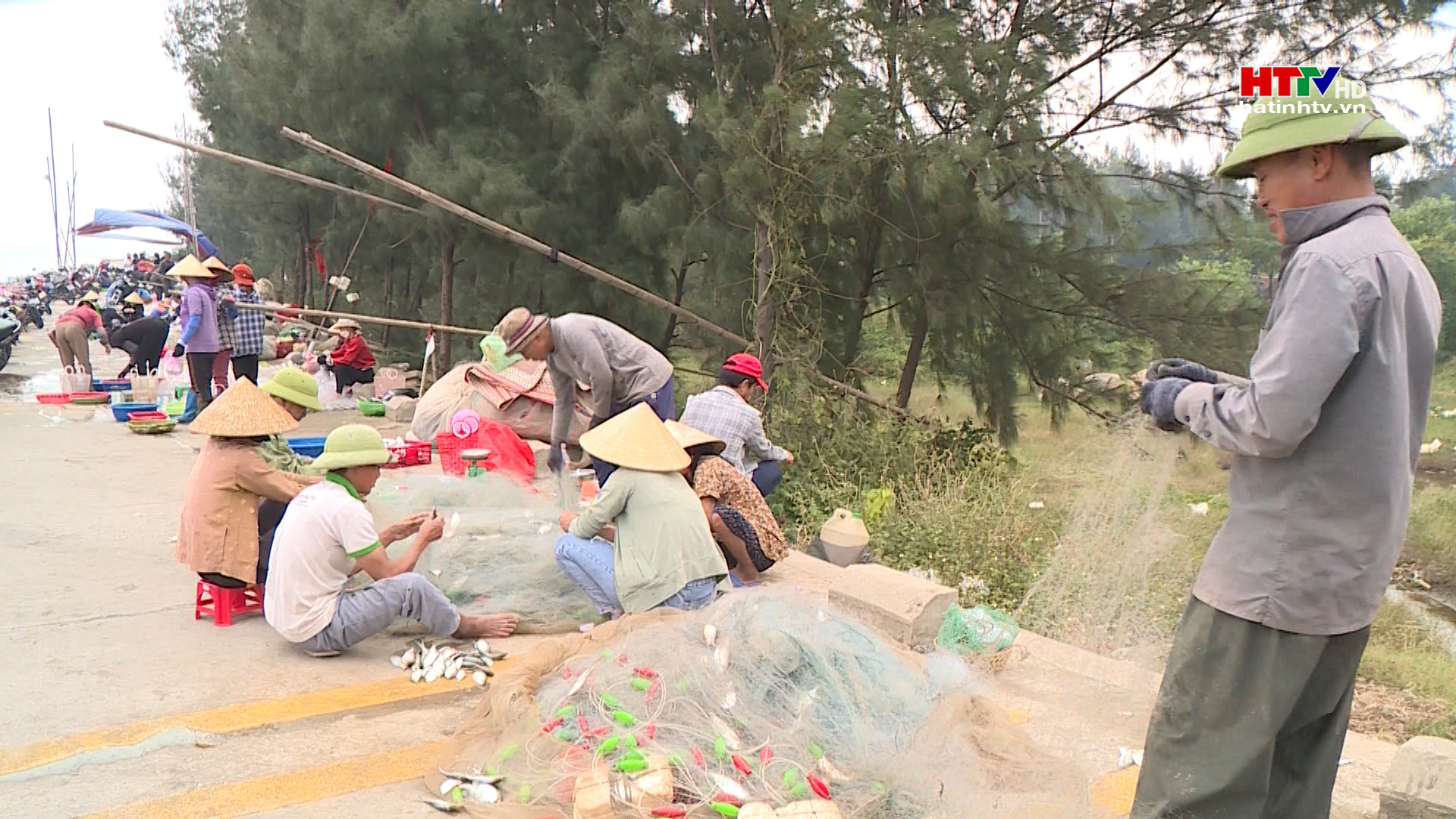 Gần một tuần nay, tại khu vực neo đậu tàu thuyền của thôn Yên Điềm, xã Thịnh Lộc huyện Lộc Hà lúc nào cũng nhộn nhịp kẻ bán, người mua. Vì ngay từ sáng sớm, trên hàng chục chiếc thuyền cập bến đã mang về hàng trăm kg hải sản như cá trích, cá mòi tôm, ghẹ các loại.