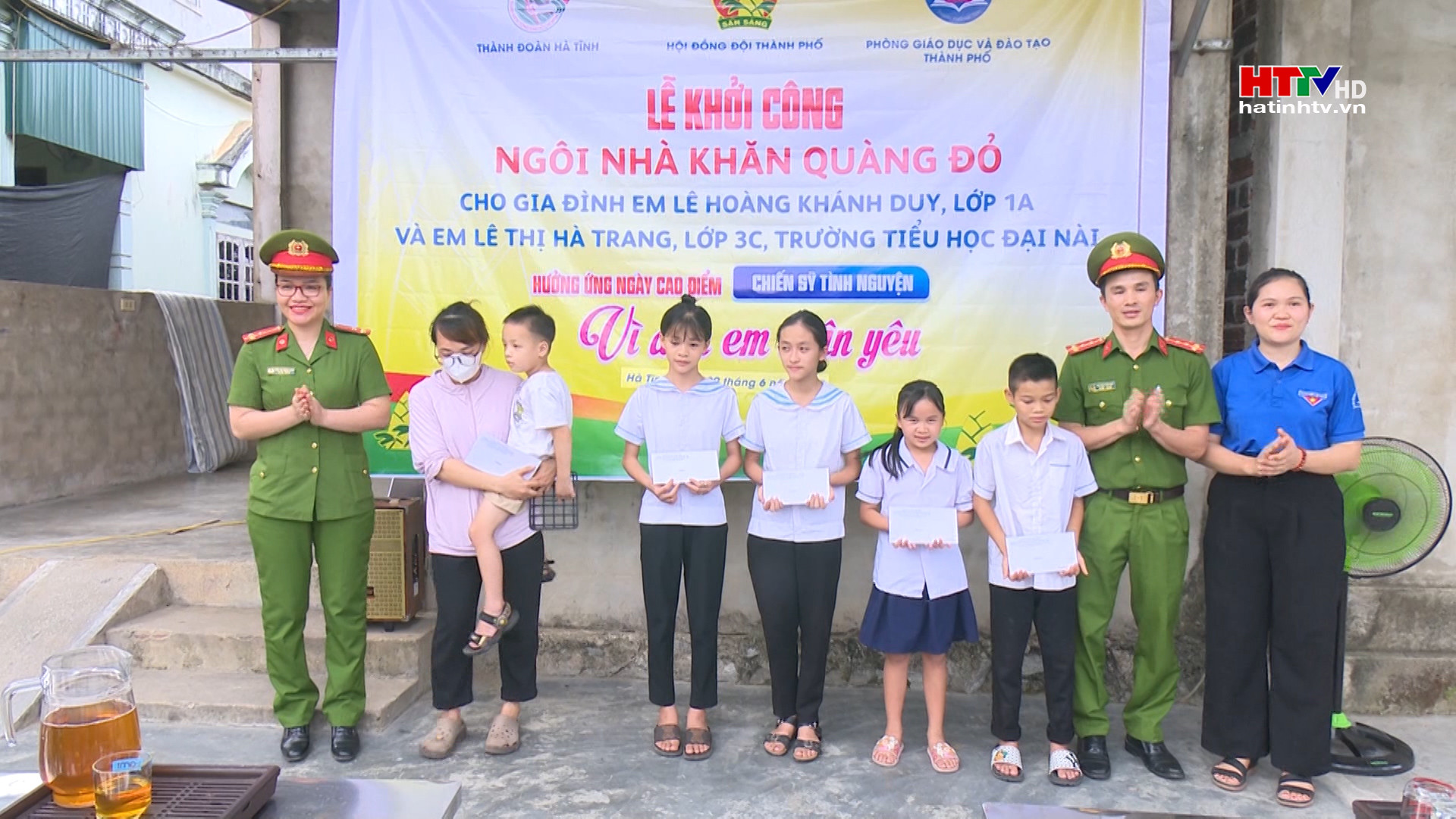 Hưởng ứng tháng hành động vì trẻ em, Hội đồng đội thành phố Hà Tĩnh vừa tổ chức khởi công xây dựng Ngôi nhà khăn quàng đỏ cho gia đình em Lê Hoàng Khánh Duy, học sinh lớp 1A, và em Lê Thị Hà Trang, lớp 3C Trường Tiểu học Đại Nài.