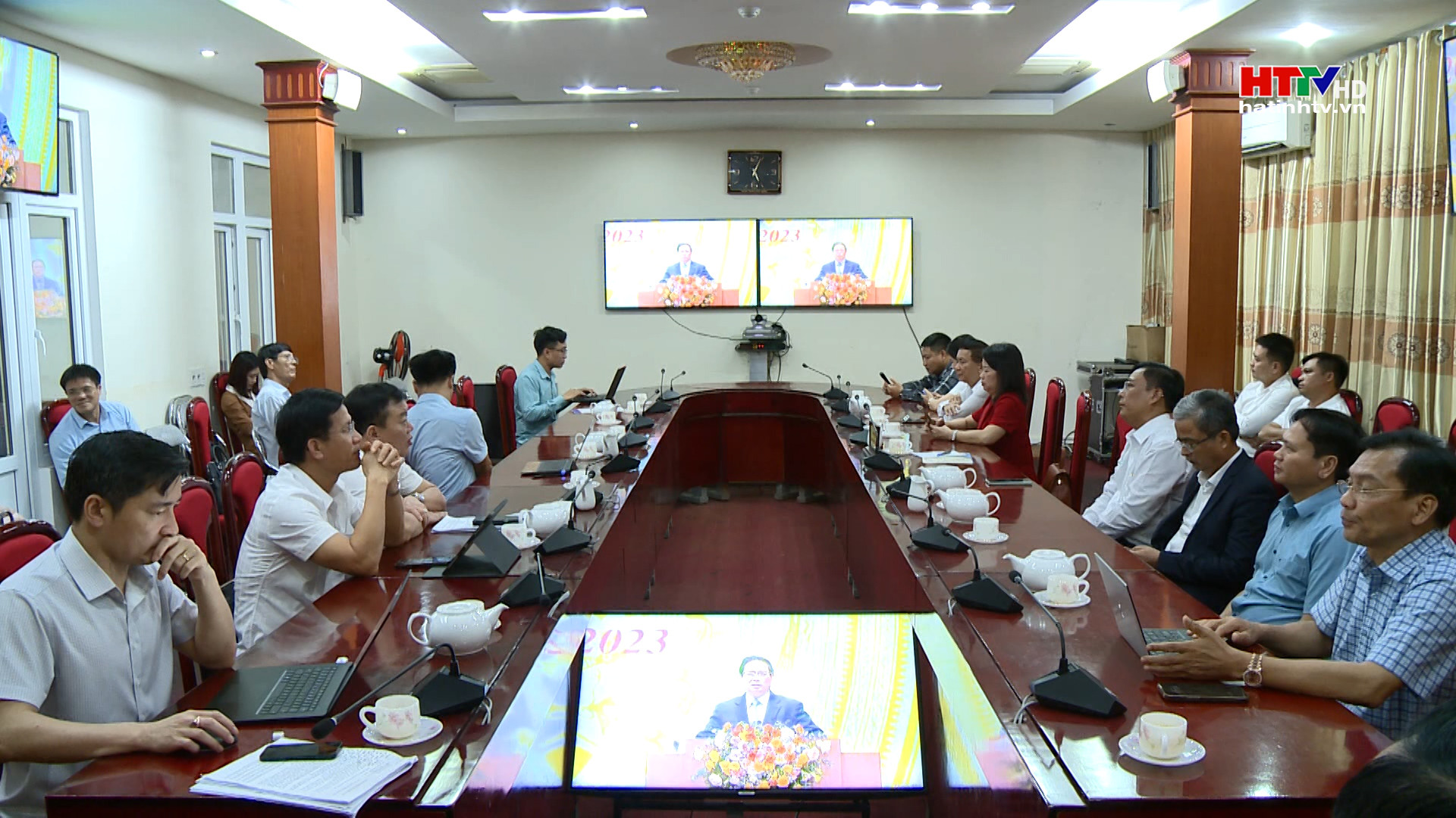 Đồng chí Võ Trọng Hải - Phó Bí thư Tỉnh ủy, Chủ tịch UBND tỉnh; đồng chí Nguyễn Hồng Lĩnh - Phó Chủ tịch Thường trực UBND tỉnh chủ trì điểm cầu Hà Tĩnh.